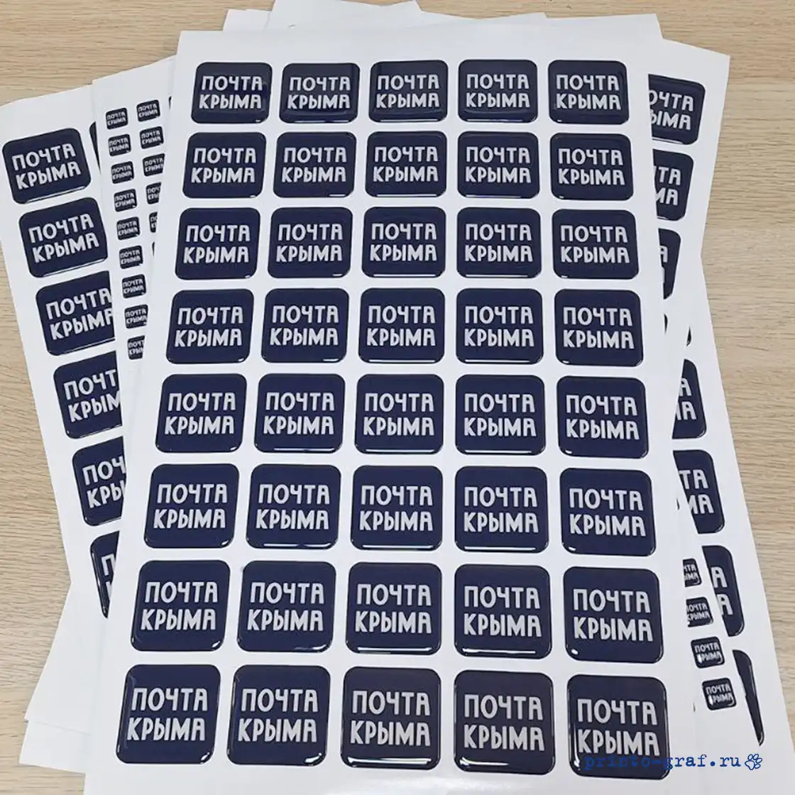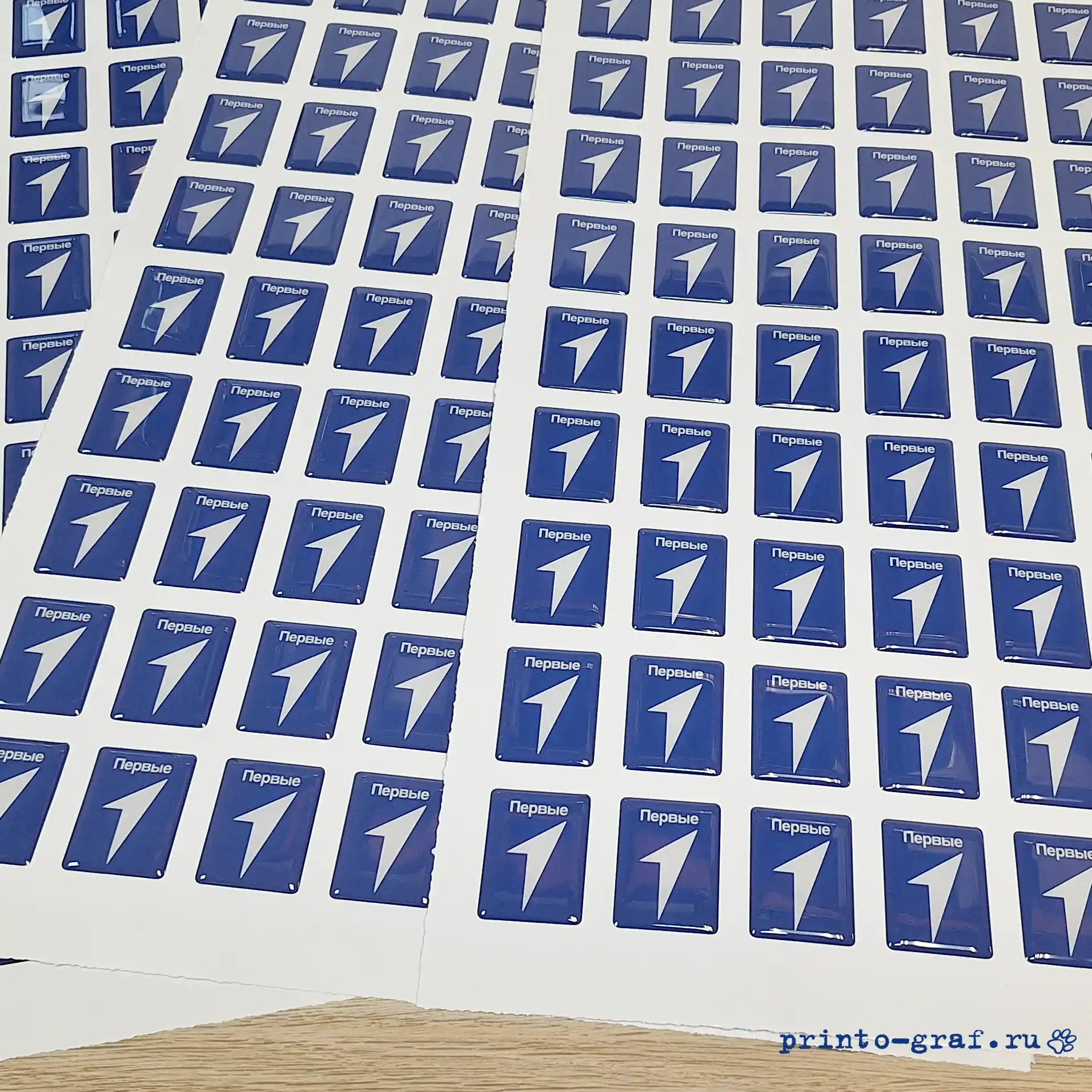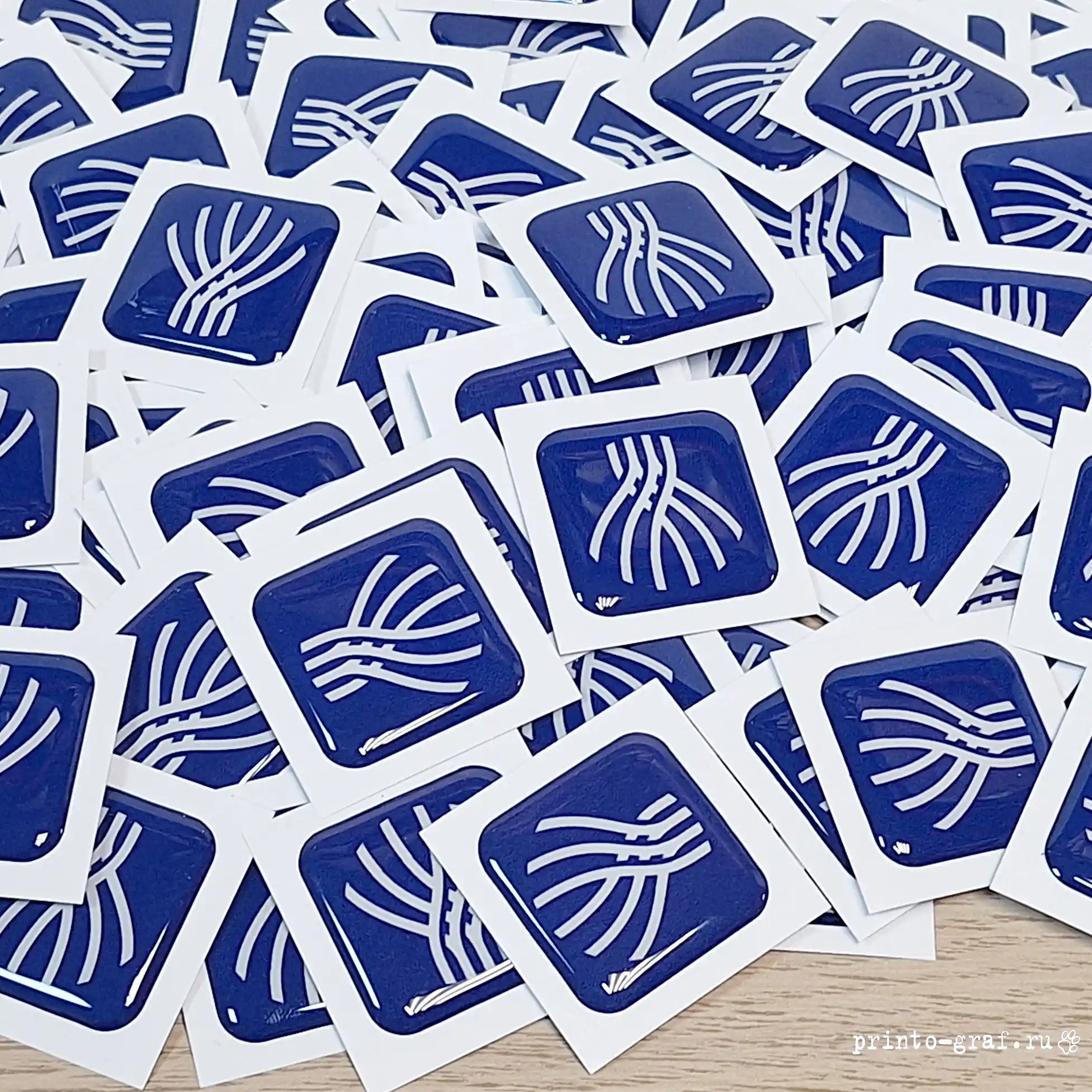 Типография Принто-граф изготавливает 3д стикерпак с наборами наклеек разной формы. Стандартная печать 3d стикерпак с эпоксидной смолой 5-9 дней, срочное изготовление займет 3-4 дня. Материал: прозрачная эпоксидная смола. Отверждённая смола становится твёрдым, прочным пластиком с твёрдостью порядка 75–85 единиц по Шору (Shore D). Прочность на растяжение составляет 40–80 МПа, на изгиб — 60–120 МПа, на сжатие — 80–130 МПа. Материал подложки пленка DLC (digital light covering) плотностью 100 мкм белого цвета (возможна полноцветная печать на подложке). Печать на пленке осуществляется на японском широкоформатном принтере MIMAKI JV 150-160, фигурная резка по контуру на автоматическом режущем плоттере iECHO PK-0705 PLUS с конвейерным столом и листовой автоподачей. Качественные экосольвентные чернила MaraJet DI-FMS позволяют различить мелкие детали изображений, фото и QR-кода. За качеством изготовления сетов объемных накллеек на печатном производстве следит ОТК.