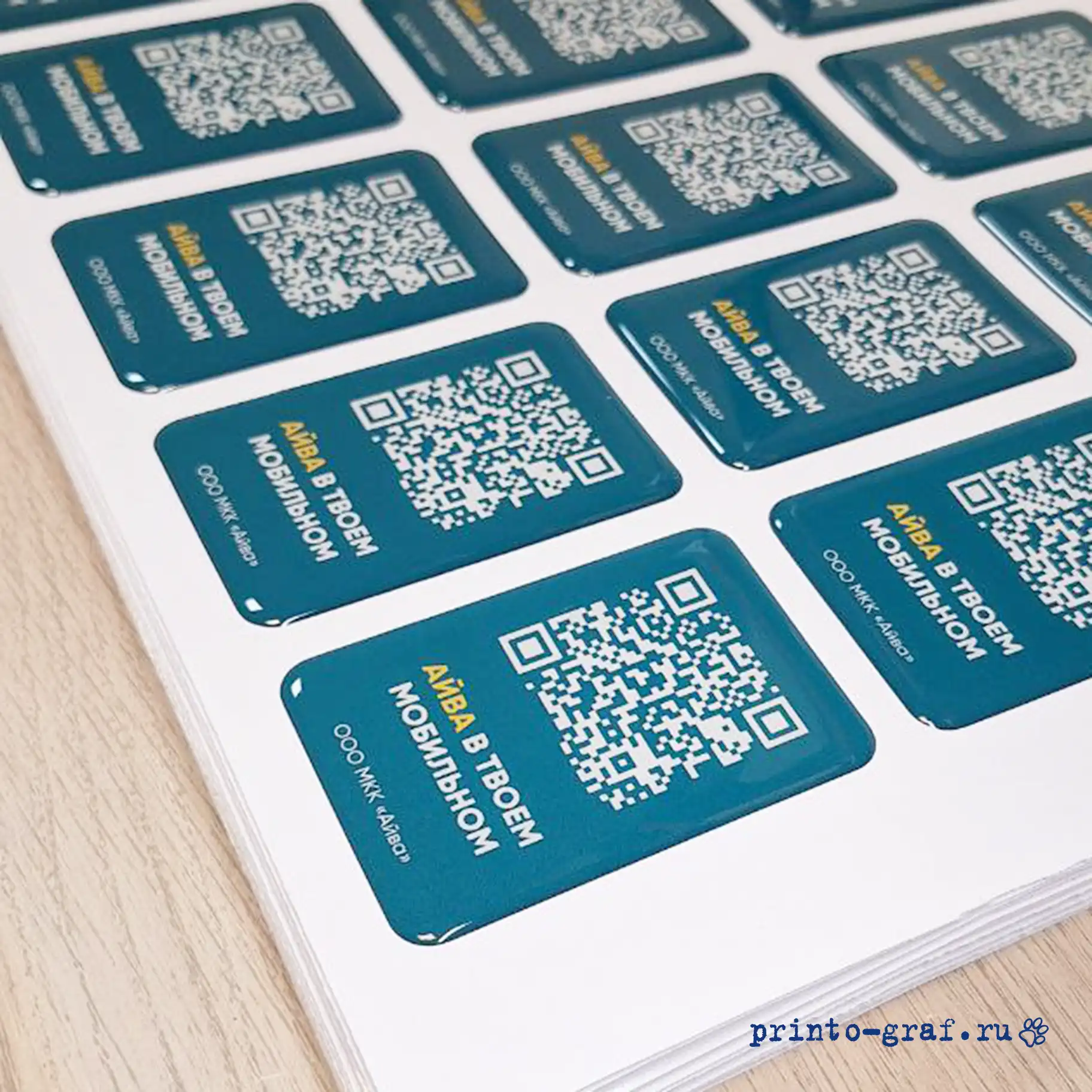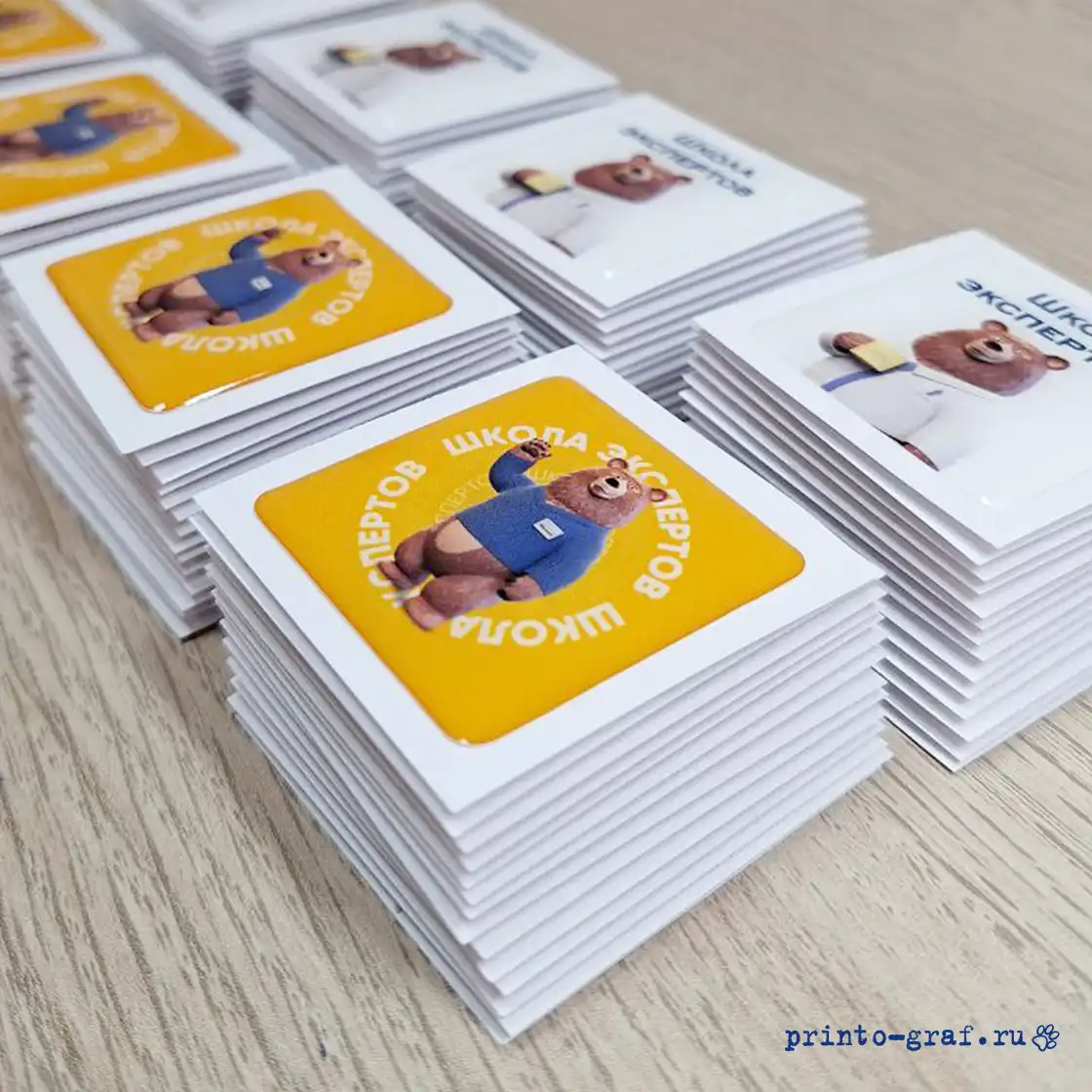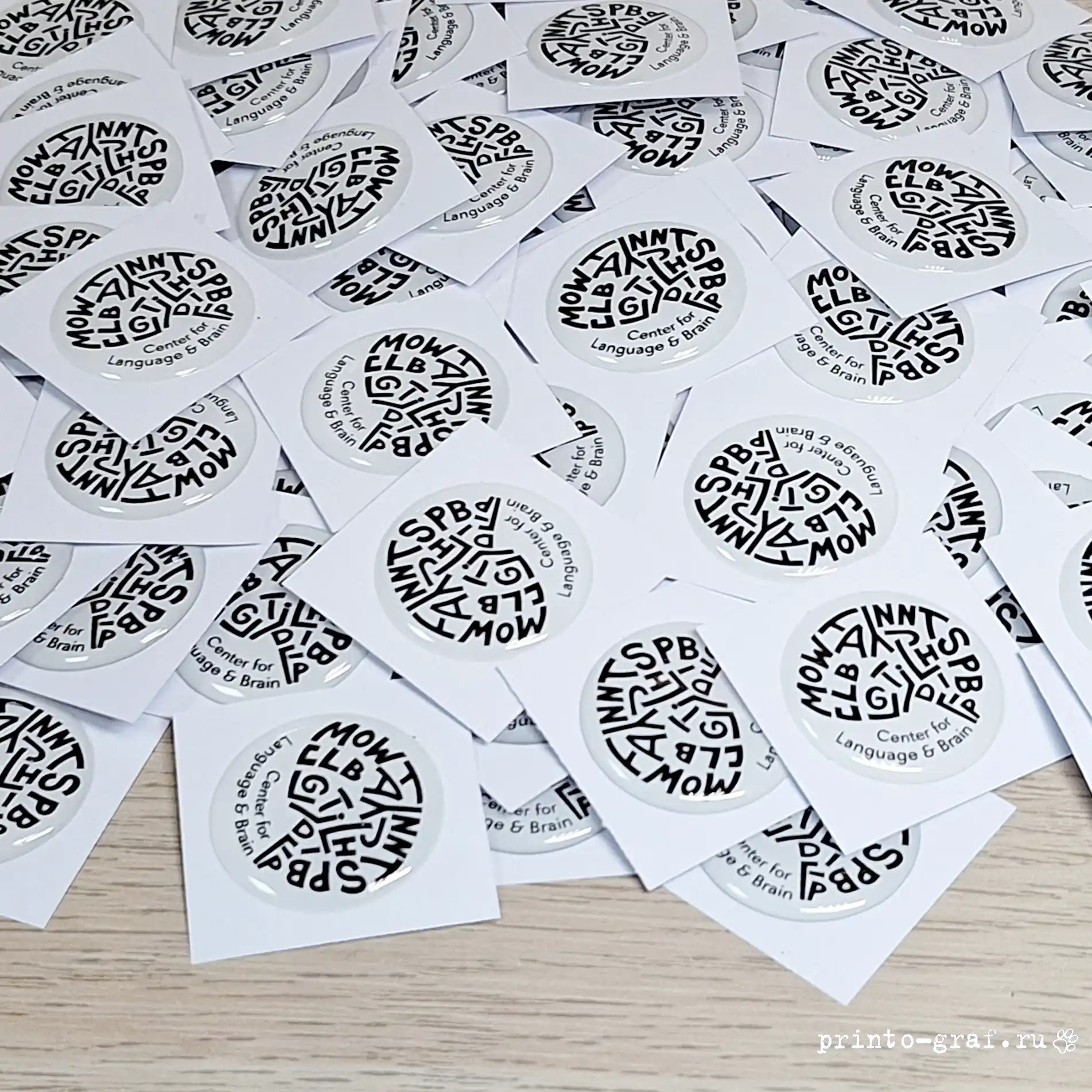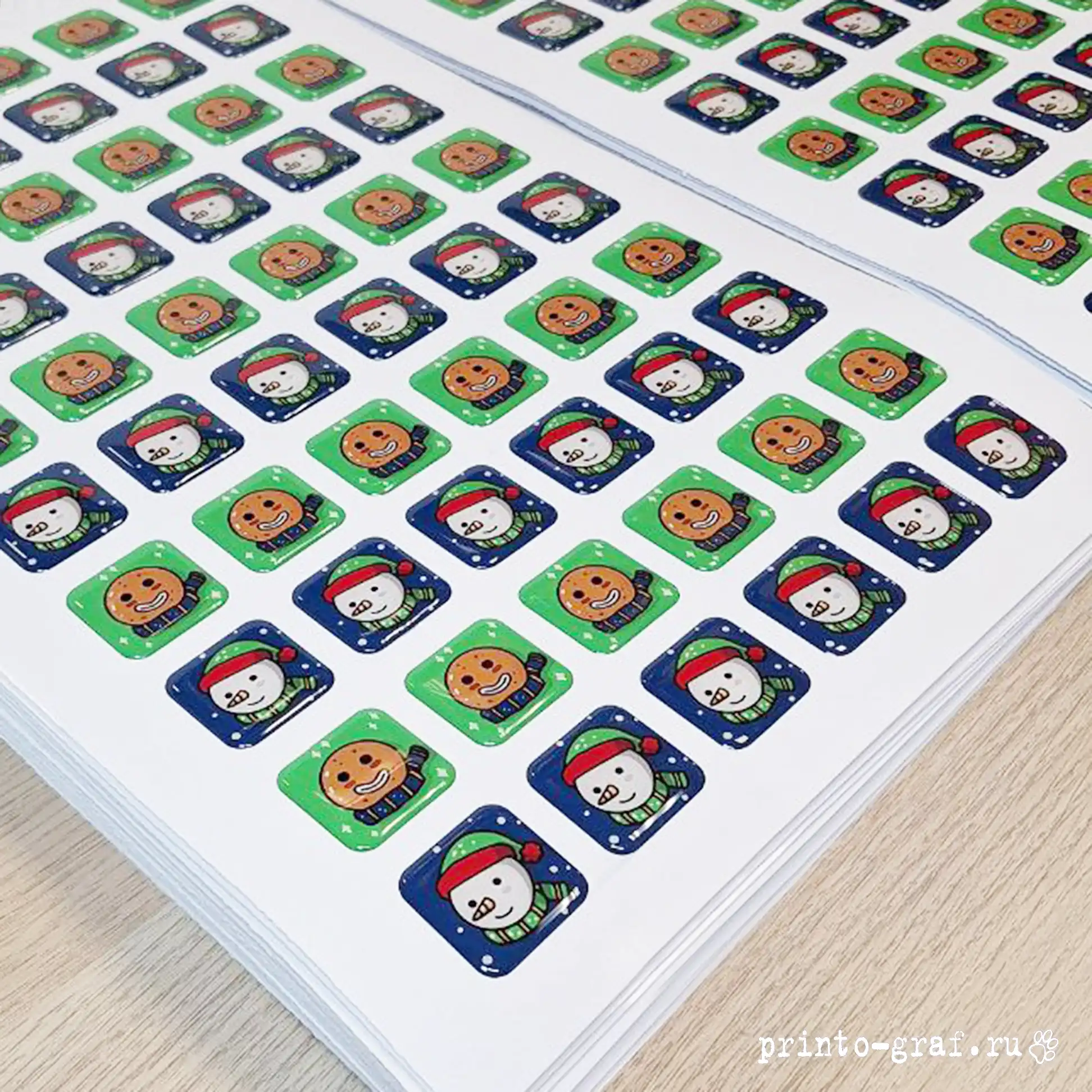 Типография Принто-граф изготавливает 3д стикерпак с наборами наклеек разной формы. Стандартная печать 3d стикерпак с эпоксидной смолой 5-9 дней, срочное изготовление займет 3-4 дня. Материал: прозрачная эпоксидная смола. Отверждённая смола становится твёрдым, прочным пластиком с твёрдостью порядка 75–85 единиц по Шору (Shore D). Прочность на растяжение составляет 40–80 МПа, на изгиб — 60–120 МПа, на сжатие — 80–130 МПа. Материал подложки пленка DLC (digital light covering) плотностью 100 мкм белого цвета (возможна полноцветная печать на подложке). Печать на пленке осуществляется на японском широкоформатном принтере MIMAKI JV 150-160, фигурная резка по контуру на автоматическом режущем плоттере iECHO PK-0705 PLUS с конвейерным столом и листовой автоподачей. Качественные экосольвентные чернила MaraJet DI-FMS позволяют различить мелкие детали изображений, фото и QR-кода. За качеством изготовления сетов объемных накллеек на печатном производстве следит ОТК.